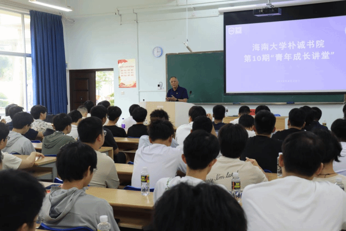 2025年4月29日下午,朴诚书院青年成长讲堂(第10期)在4-111教室举行,校关工委副主任、特邀党建组织员杨云山应邀参加并为师生作校史专题报告,带领大家深情回顾海南大学“荒滩筑新城”的艰苦奋斗之路。朴诚书院党委副书记闫治、全体辅导员和学生党员、入党积极分子、2024级学生代表参加,本期讲堂由朴诚书院党委委员宋海婷主持。