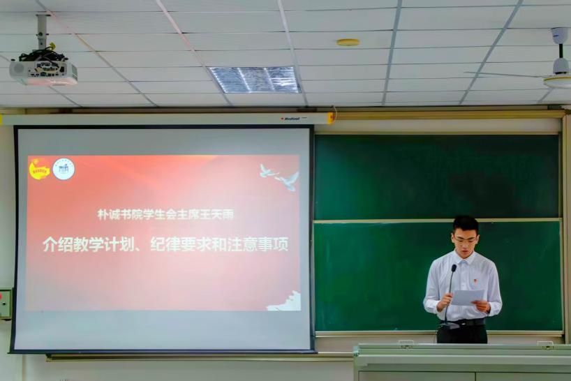 朴诚书院学生会主席团成员、拓新班班长王天雨介绍了教学计划、纪律要求和注意事项。本次训练营共18课时,由专题讲座、参观学习、素质拓展、交流研讨等环节组成。