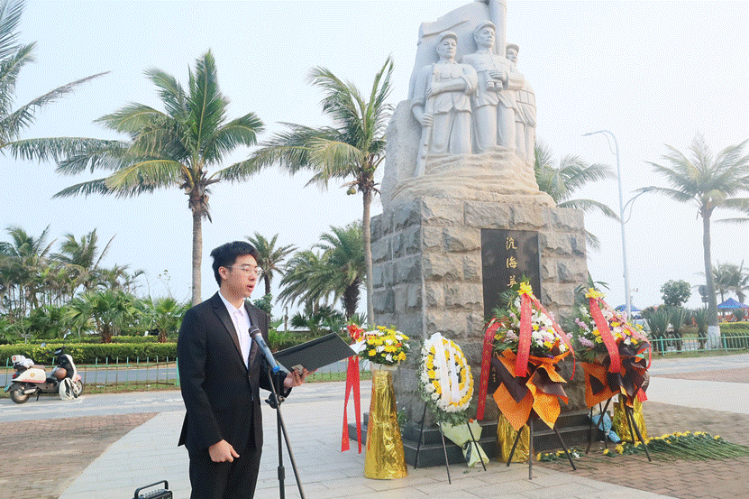 第一党支部杨雯淇代表新党员发言。他回顾了白沙门渡海作战革命英雄的事迹,并表示会以革命英雄为榜样,坚定理想信念,继承英烈遗志,强化责任担当,争做时代先锋。